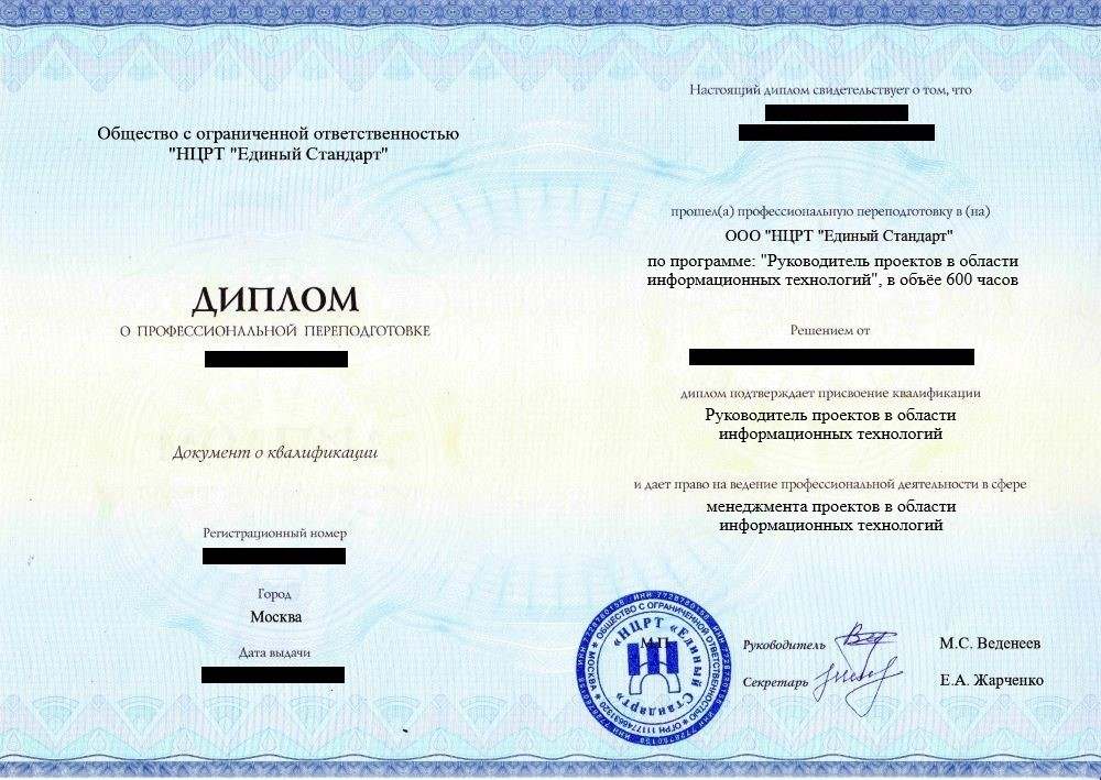 • «Руководитель проектов в области информационных технологий» с правом ведения профессиональной деятельности в сфере менеджмента проектов в области информационных технологий