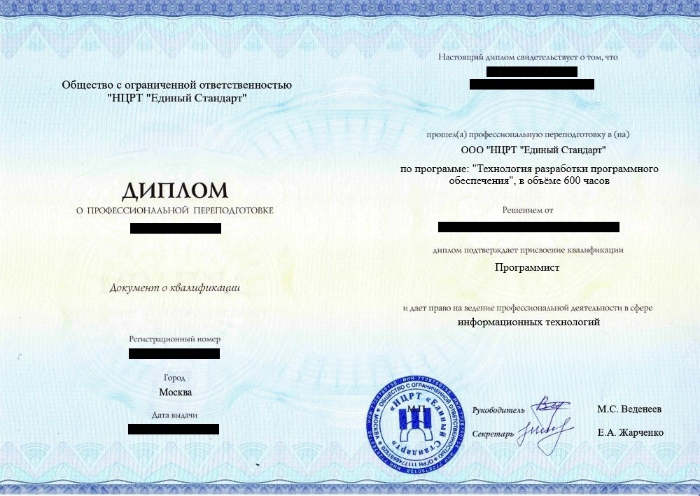 • Диплом о профессиональной переподготовке установленного государством образца. Срок действия: бессрочно