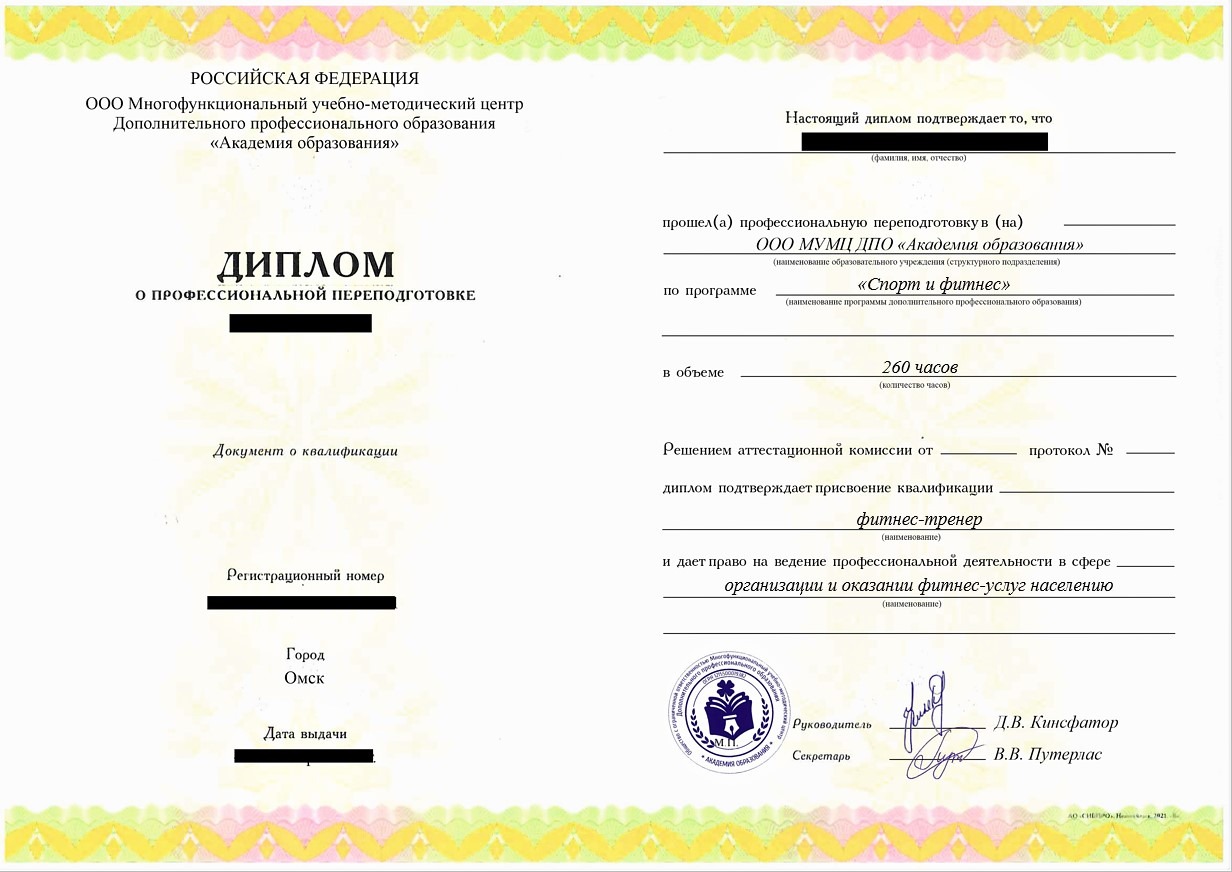 • «Фитнес-тренер» с правом ведения профессиональной деятельности в сфере организации и оказании фитнес-услуг населению